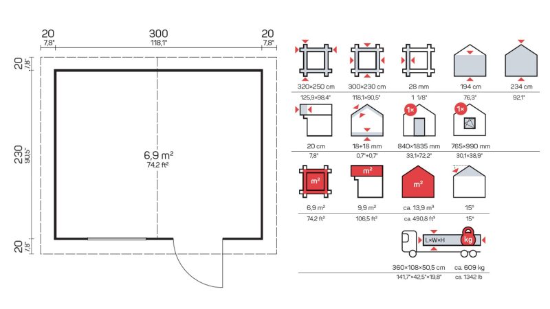 Dimenzije zidova (širina x dužina): 300 x 230 cm