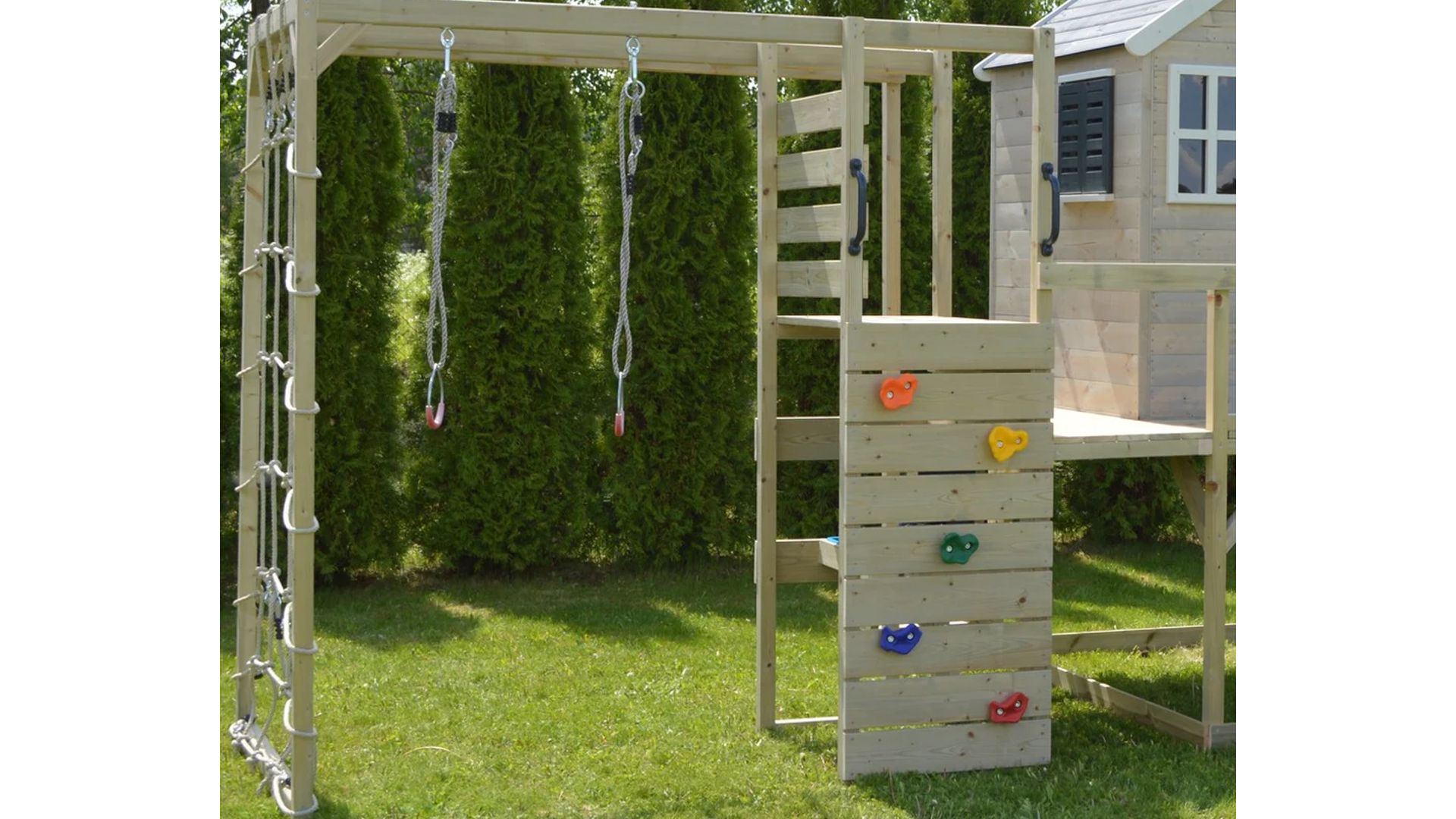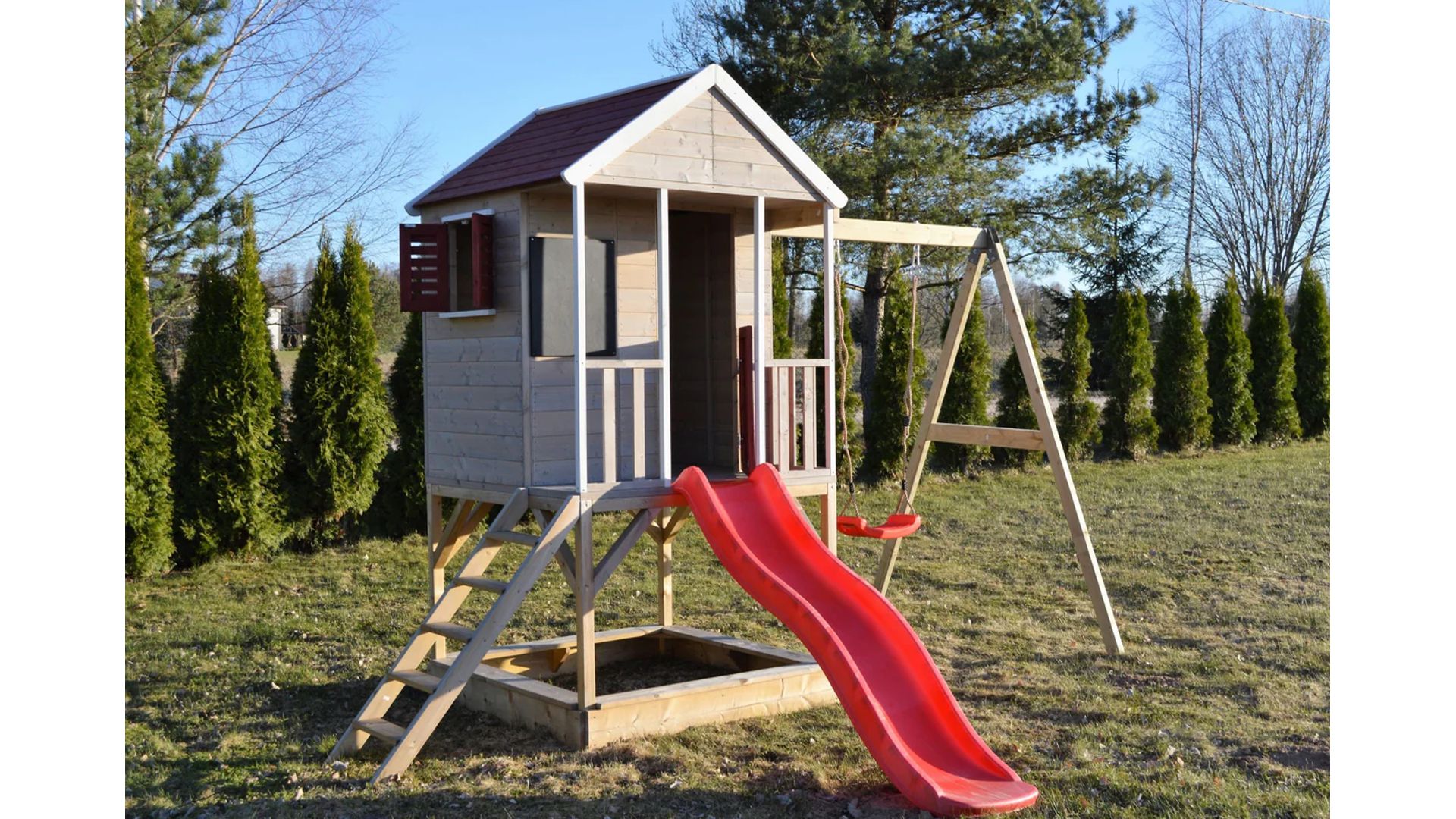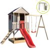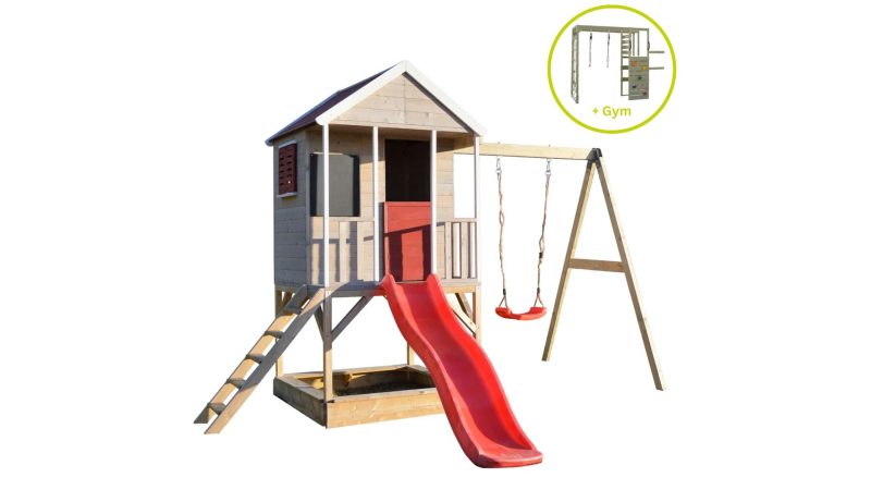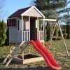 Izgrađena na platformi visokoj 90 cm, ova kućica za igru ​​​​će vaše mališane držati aktivnima i zaokupljenima satima. S pješčanikom ispod, pločom za crtanje, funkcionalnim prozorom s kapcima, terasom i policom, kućica za avanturu prepuna je značajki koje će igru ​​vašeg djeteta učiniti još uzbudljivijom! A kao da to nije dovoljno, tu je i priloženi plastični tobogan dug 175 cm i ljuljačke visoke 200 cm sa strane. Pravi adrenalin!