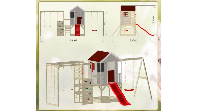 Predstavljamo M9R-G Kućica s platformom, toboganom i jednom ljuljačkom + dodatak za teretanu – vrhunsko igralište za bezgraničnu kreativnost i bujnu maštu vašeg djeteta! Ova modularna kućica za igru ​​​​je više od mjesta za igru ​​​​- to je svijet zabave i uzbuđenja koji čeka da bude istražen.