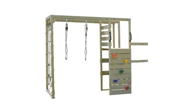Pripremite se gledati kako vaša djeca istražuju, vježbaju i zabavljaju se na svježem zraku uz dodatak za teretanu. S dovoljno prostora za igru ​​do troje djece, odlično će se zabaviti testirajući svoje granice i izazivajući se uz zid za penjanje, mrežu za penjanje, gimnastičke krugove i šipku za penjanje.